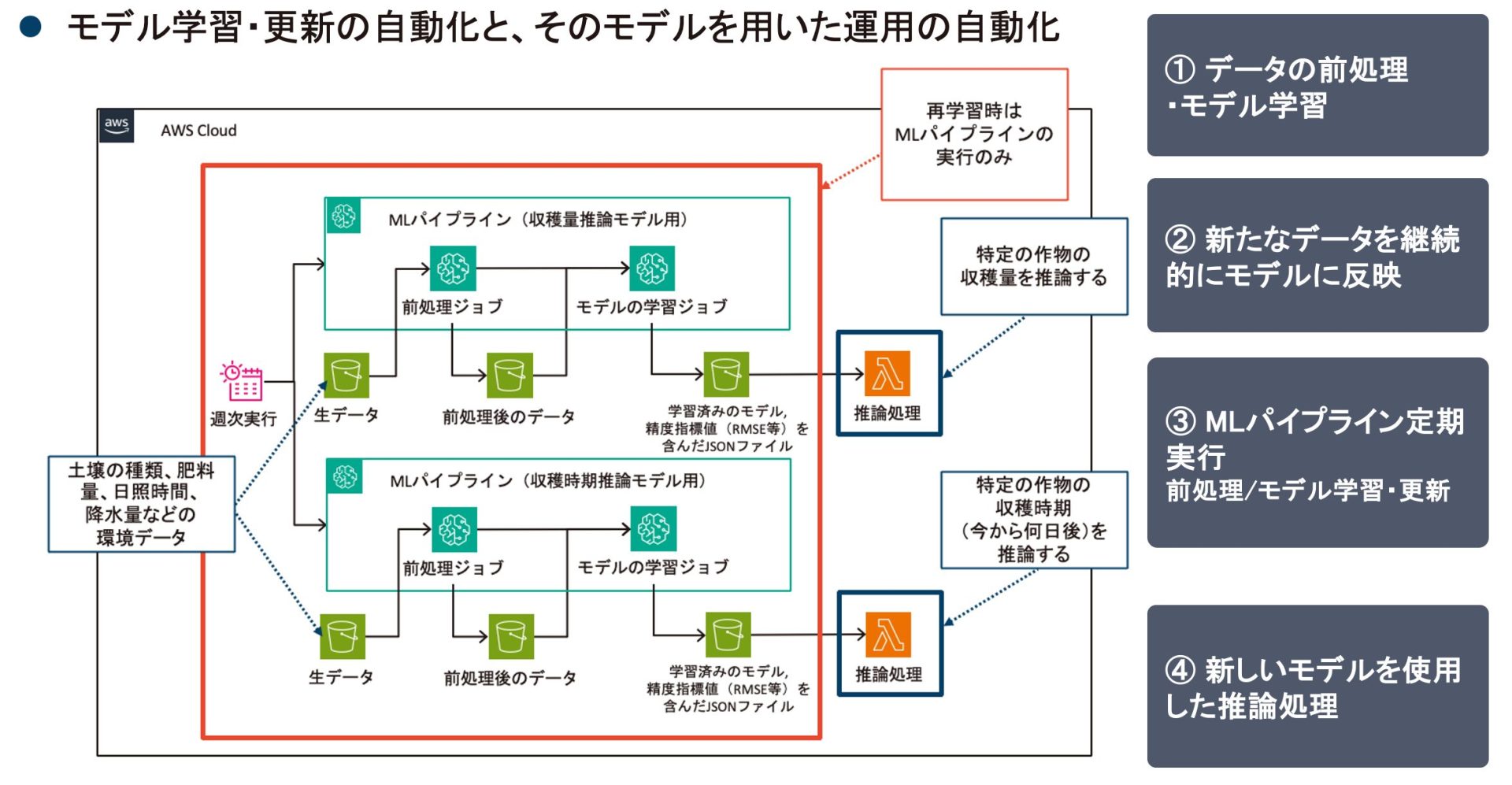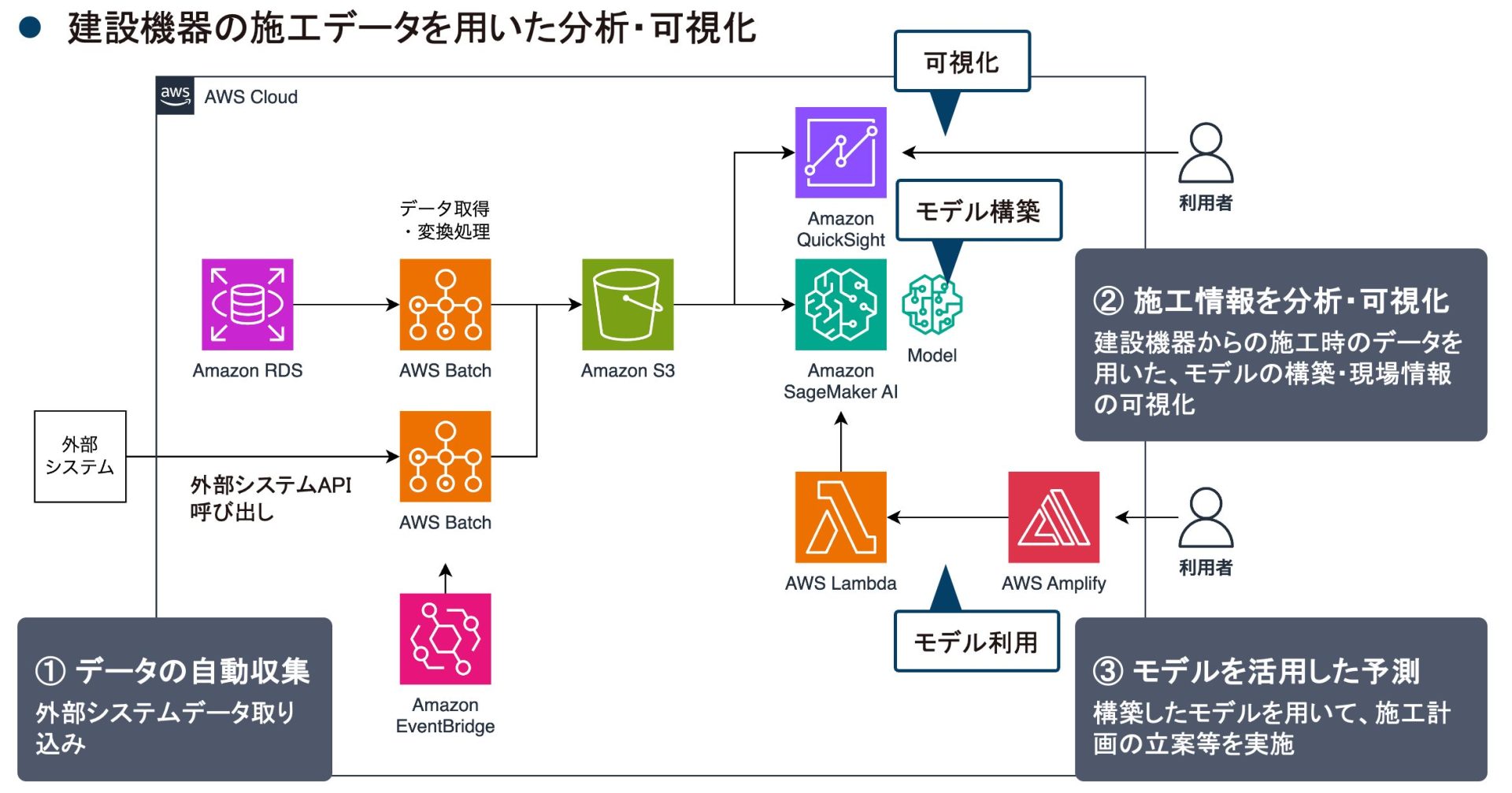 複数のシステムからデータを自動集約し、S3 に統合します。この統合データで予測モデルを構築し、計画立案などの予測処理を自動で実行します。推論結果を業務アプリケーションに直接反映・可視化することで、迅速かつデータに基づく意思決定プロセスを自動で支援する仕組みです。