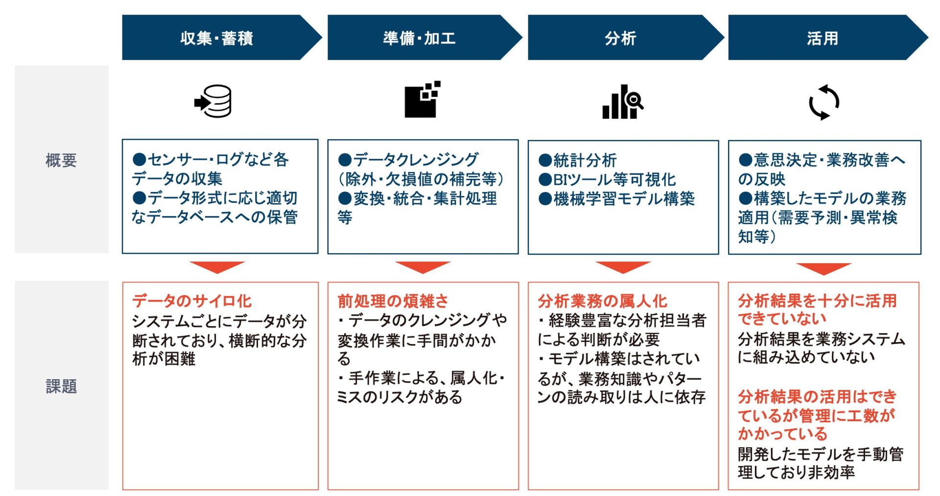 データ活用には、収集・蓄積、準備・加工、分析、そして活用といったステップが存在します。そして、各ステップには躓きやすい課題や、実際にその取り組みをはじめた後で直面する運用の壁が存在します。