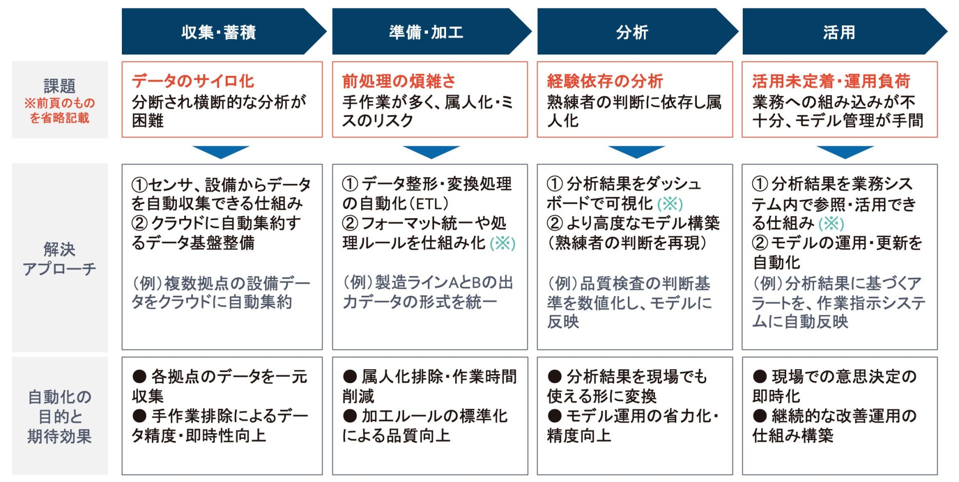 - 解決策の例:熟練者による判断基準をダッシュボードなどで可視化し、誰もが見える仕組みを構築します。また、熟練者の経験や判断プロセスを機械学習で学習させ、AIモデルを構築して判断を補助します。