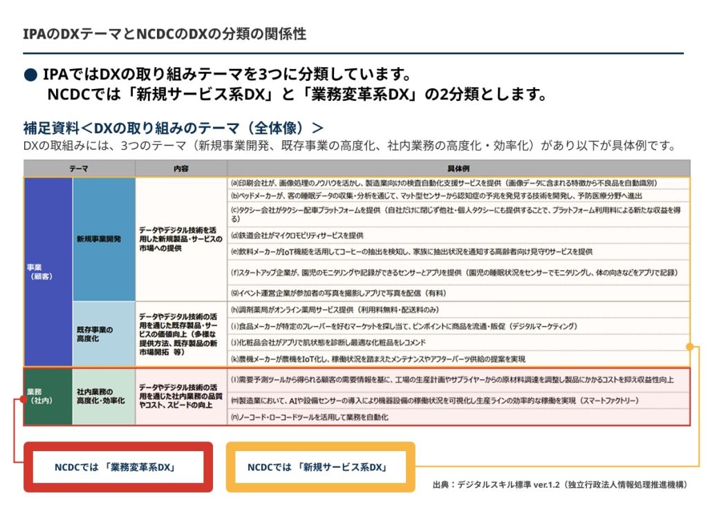 NCDCでは、これら3つのテーマについて、その主目的が「新たな価値創出」(新規事業開発、既存事業の高度化)にあるのか、「内部業務の変革」(社内業務の高度化・効率化)にあるのかという実践的な観点から捉え直し、「新規サービス系DX」と「業務改革系DX」の2分類として整理しています。