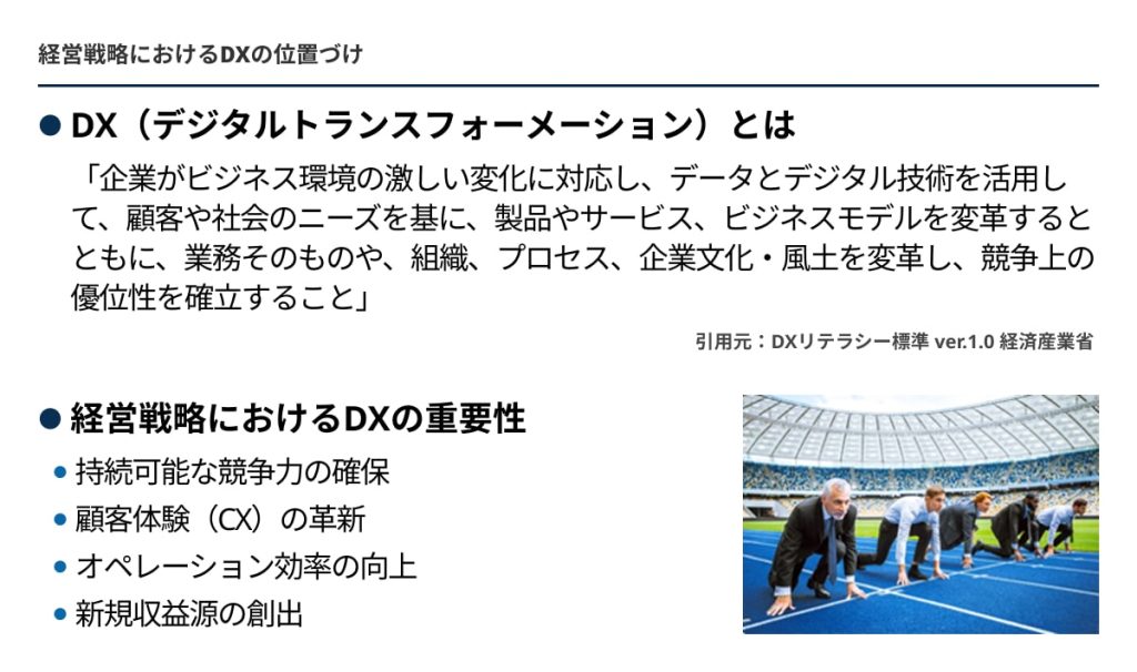 DXとは、データやデジタル技術を活用してビジネスモデルや業務プロセスを変革し、競争優位性を確立する戦略的取り組みです。経営戦略においては、持続可能な競争力の確保、顧客体験(CX)の革新、オペレーション効率の向上、新規収益源の創出といった観点から重要な役割を果たします。