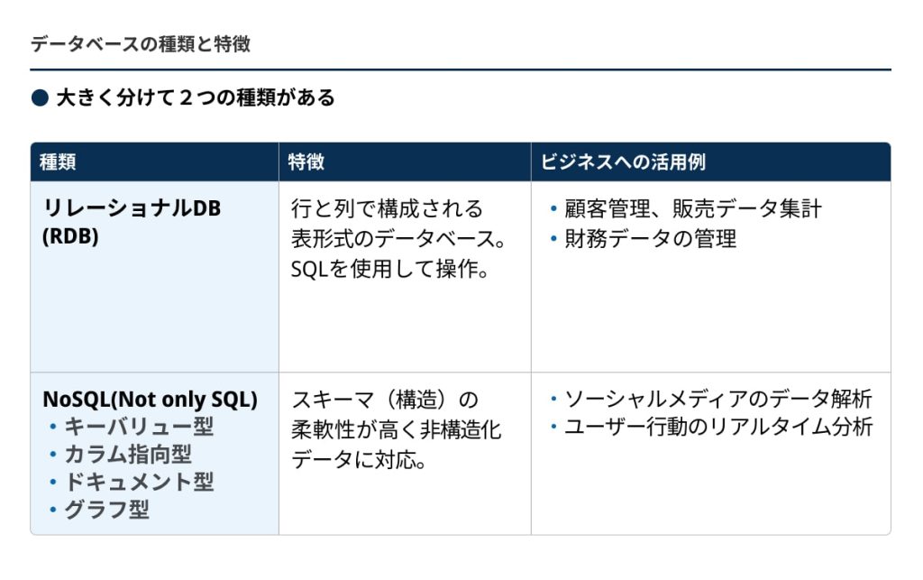 DX時代において、データは最も重要な資産の一つです。データの収集、管理、分析を適切に行うためには、リレーショナルデータベース(RDB)とNoSQLの特性を理解し、適切なデータ基盤を構築することが不可欠です。