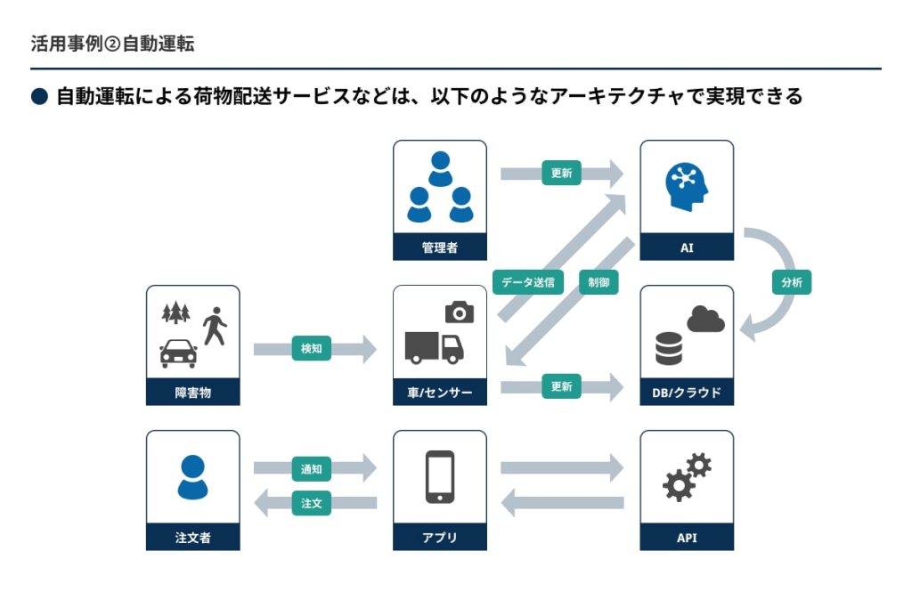 そこで登場するのが、車両自体に搭載されたコンピューターである「エッジコンピューター」です。AIによるデータ分析など、処理が重いものはデータ送信先で行いますが、その分析結果を使った処理は車両のエッジコンピューターで行われます。