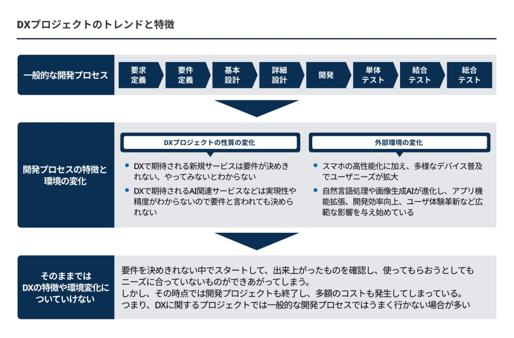 DXを推進する上で、開発手法の選択はプロジェクトの成否を大きく左右します。従来のウォーターフォール型開発は、計画重視で着実な進行を可能にする一方で、仕様を途中で変更できないなど変化への対応力に課題が残ります。一方、アジャイル型開発は、柔軟性と迅速な開発を強みとするものの、計画の精度や全体像の把握が難しい側面も持ち合わせています。DXプロジェクトにおいては、これらの開発手法の特性を深く理解し、プロジェクトの特性、期間、予算、変化への対応力などを考慮して、ウォーターフォール、アジャイル、または両者を組み合わせたハイブリッド型を選択することが不可欠です。本パートでは、各開発手法の基礎知識、メリット・デメリット、それぞれの開発プロセスなどを学ぶことで、DXプロジェクトを推進していく上で最適な開発手法を選択できるようになります。