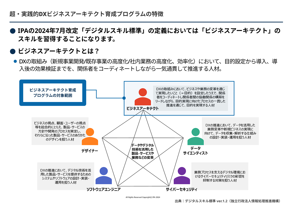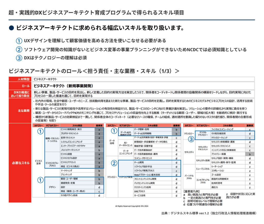 本プログラムは、IPA(情報処理推進機構)が定める「デジタルスキル標準」(2024年7月改定)における「ビジネスアーキテクト」に必要なスキルを体系的に習得できるよう設計されています。