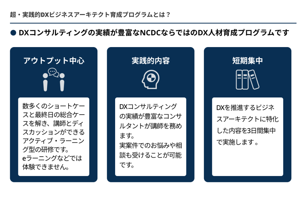 本プログラムは、DXコンサルティングで豊富な実績を持つNCDCだからこそ提供できる、実践的なDX人材育成プログラムです。
