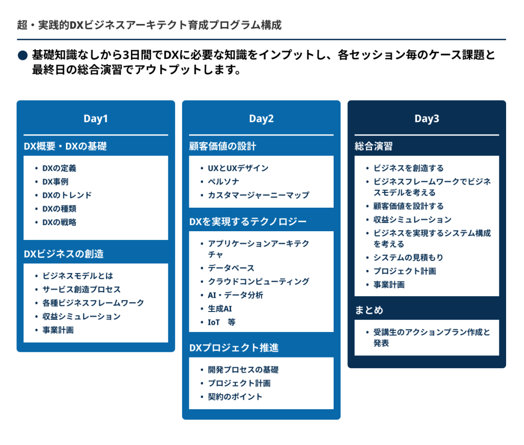 こうした背景から、NCDCではビジネスアーキテクト候補となる人材をできるだけ短期に育成するための短期集中型アクティブラーニング研修プログラム「超・実践的DXビジネスアーキテクト育成プログラム」を開発しました。このプログラムの基本コースは3日間で実施します。最初の2日で知識のインプットとショートケースによるアウトプットを繰り返して基礎知識を習得します。最終日の3日目にはDXによるビジネス創造からDXプロジェクト運営や計画をたてるところまでをリアルなケースで実施します。