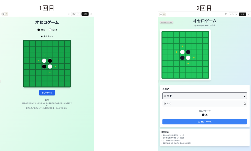 例えば、以下はどちらも、「試しにオセロゲームを作ってください」という簡単な指示で生成させたオセロゲームです。