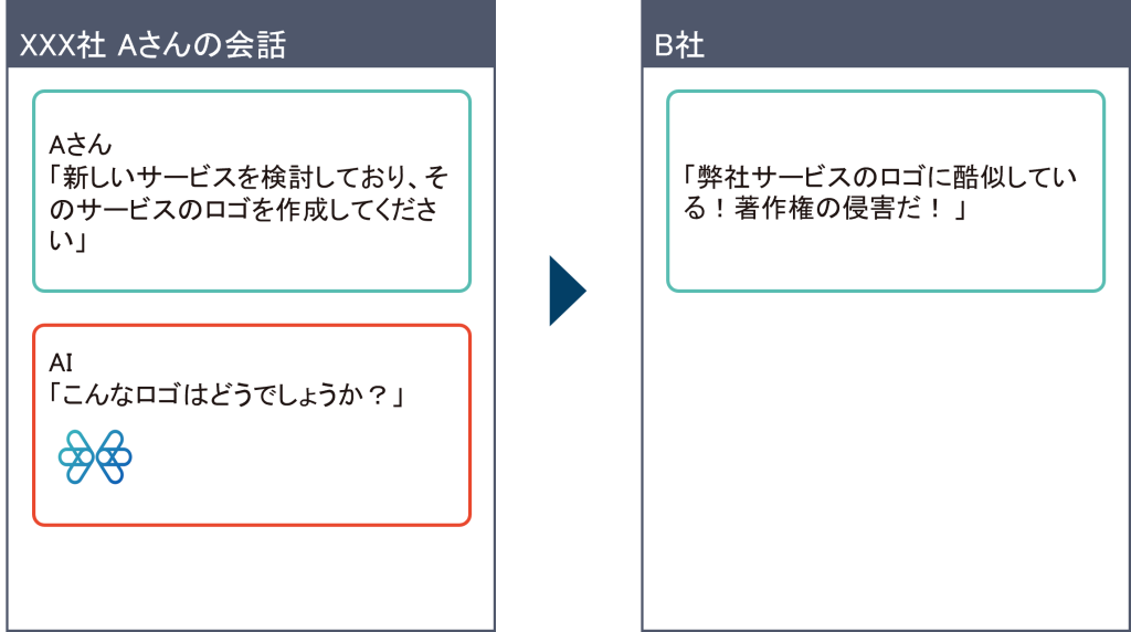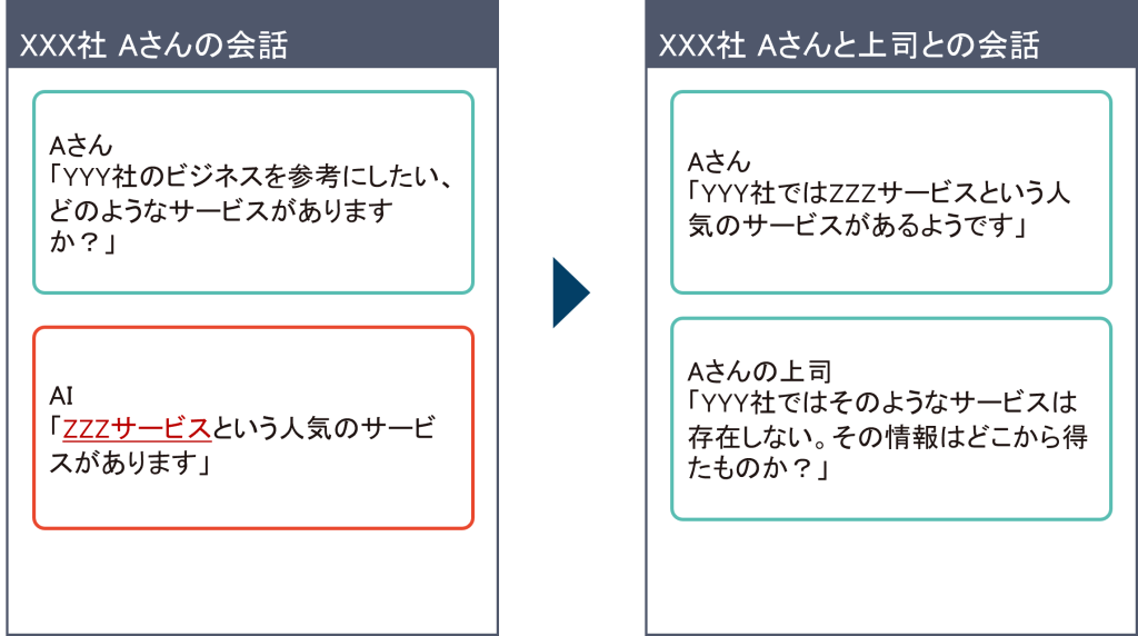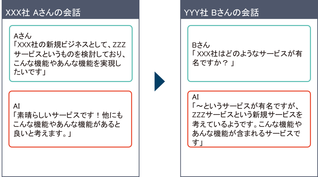 たとえばXXX社の人が内部情報(新規事業のアイデア)をAIに相談したところその相談内容をAIに学習されて、競合のYYY社にアイデアが漏れてしまうという可能性もあります。