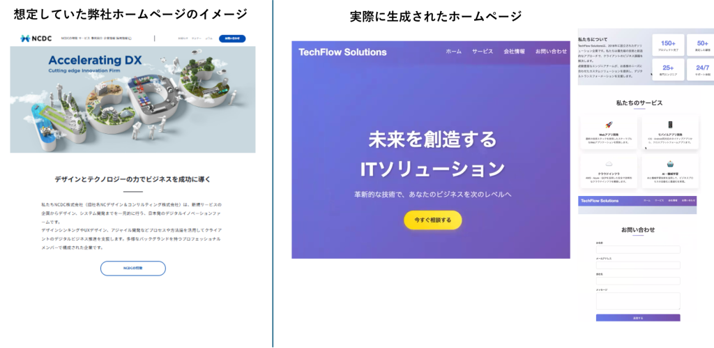 バイブコーディングのデモのひとつは簡単なホームページの生成です。当社(NCDC)のホームページをイメージしながらも、あえて細かい指示を書かずに「簡易的な企業HPを作ってください」と依頼してみます。すると、たったこれだけの指示でAIがページを作成してくれました。