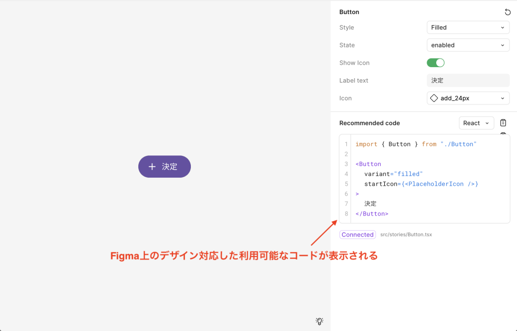 技術的な詳細は省きますが、簡単に言うと Code Connect は「Figma上のコンポーネントと実装側のコンポーネントを紐付け、Figma上に利用可能なコードを表示する仕組み」です。