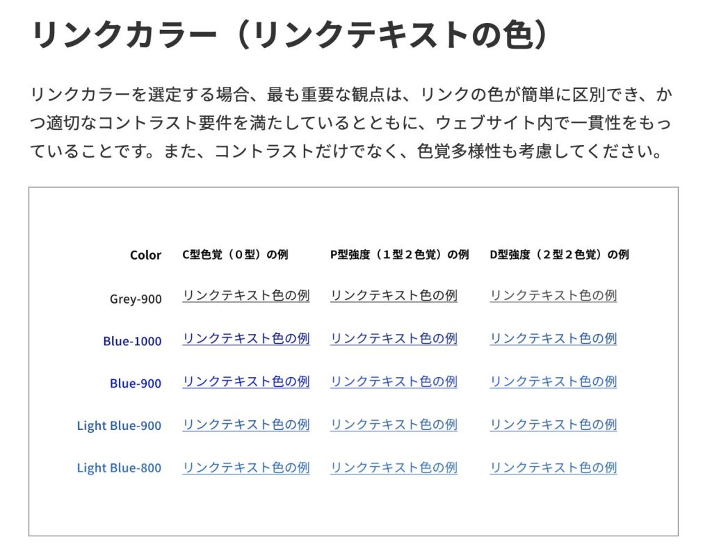 例えば、デジタル庁デザインシステムでは、リンクテキストの色だけでも色覚多様性も考慮してどう設定すべきかという指針を具体的に示しています。