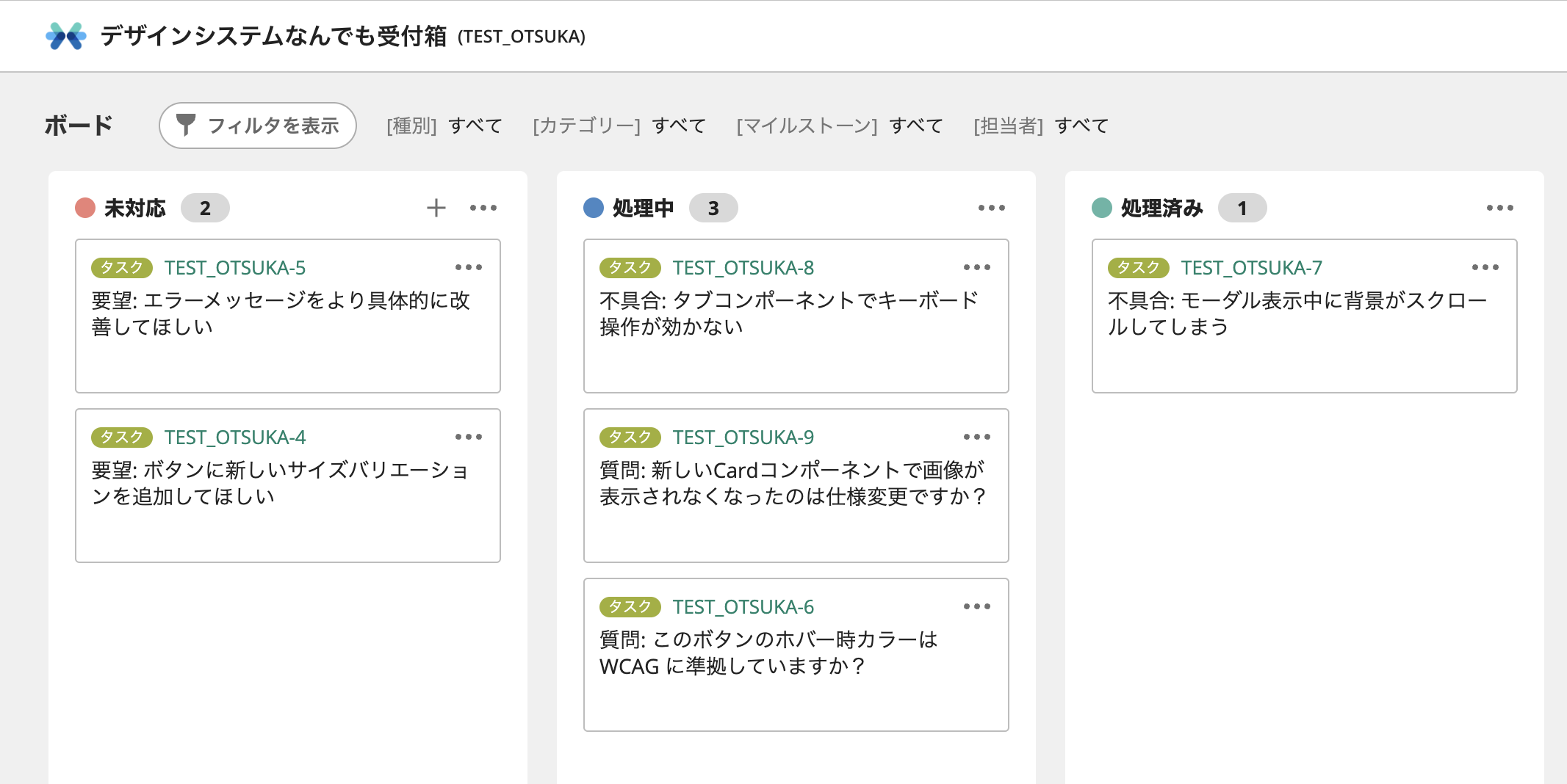 特にチームが分かれている環境では、プロダクトチームからデザインシステムチームへ要望を伝えることに、心理的な抵抗を感じる場合があります。そのため、誰もが気軽に意見を投稿できる「窓口」を用意することが効果的です。「何かあれば連絡してください」というスタンスだけでなく、個人宛てではない「場」に対して意見を投稿できる仕組みを設けましょう。