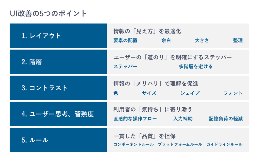 本セミナーで紹介された5つのUI改善ポイントは以下の通りです