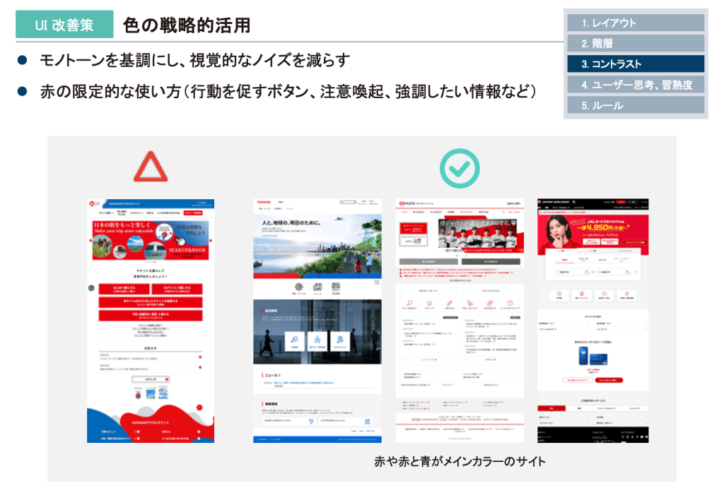 モノトーンを基調にすることで視覚的なノイズを減らし、赤色は行動を促すボタン・注意喚起・強調したい情報など、限定的な場面でのみ使用することで情報のメリハリをつけ、ユーザーの理解を促進できます。