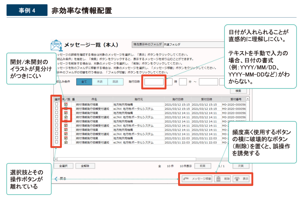 地方税の申告・申請・納税ができるサービス「eLTAX」のメッセージ一覧画面では、閲覧したいメッセージをチェックボックスで選択し、「表示」ボタンをクリックする必要がありました。