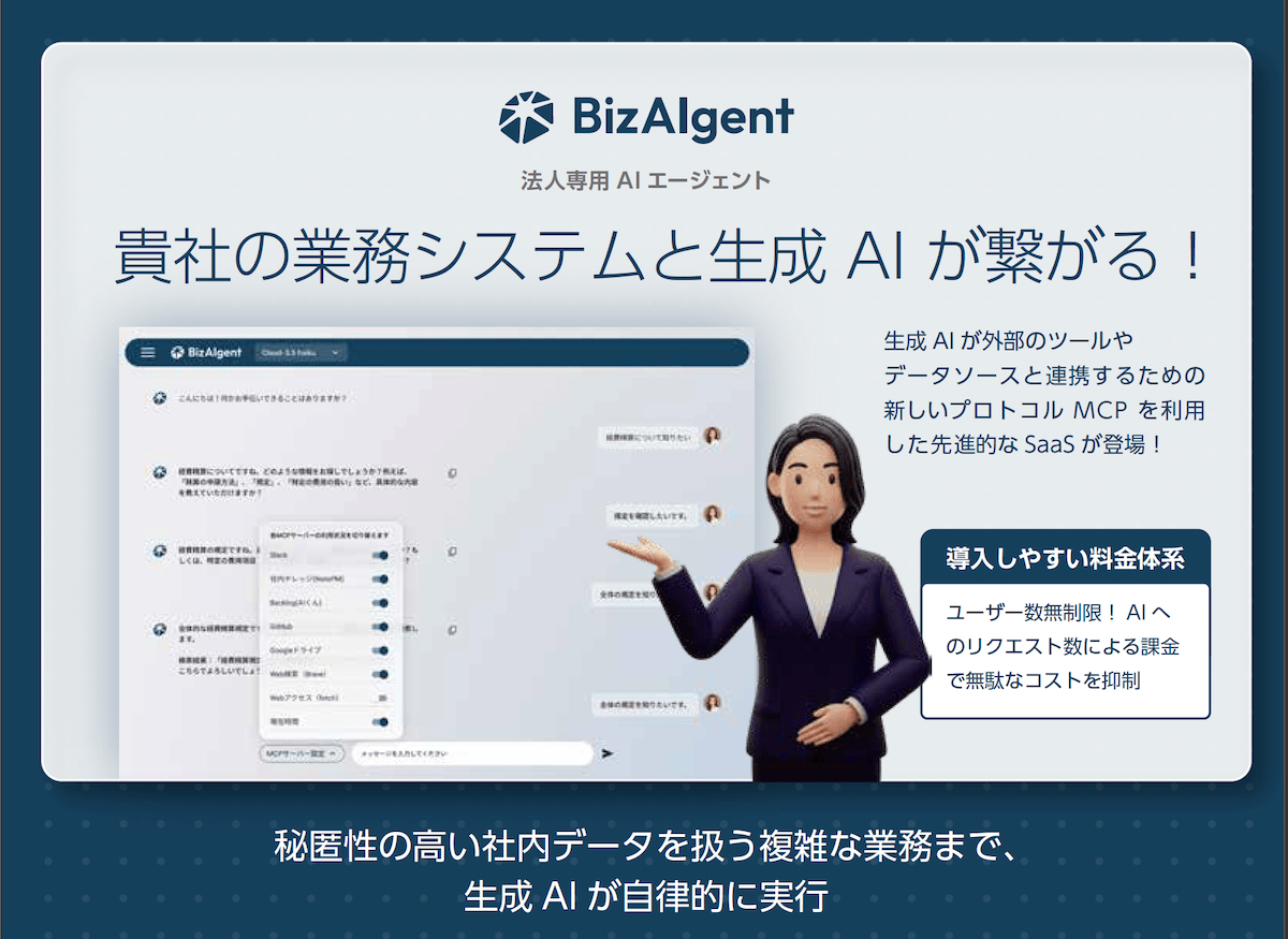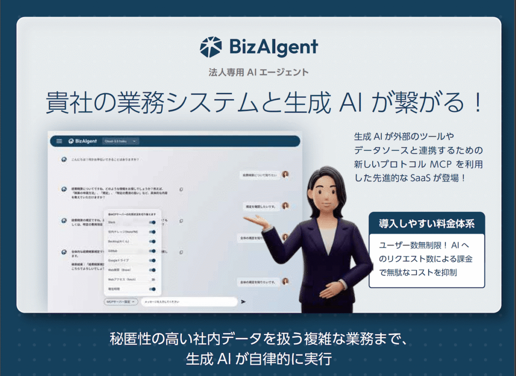 BizAIgent(ビズエージェント)は、AIが外部データと連携する標準プロトコルMCPを活用し、企業が社内で利用しているシステムと生成AIを組み合わせることで、高品質な自社専用AIチャットを実現。情報の精度や情報管理のガバナンスといった、企業における生成AI利用の課題を解決します。
